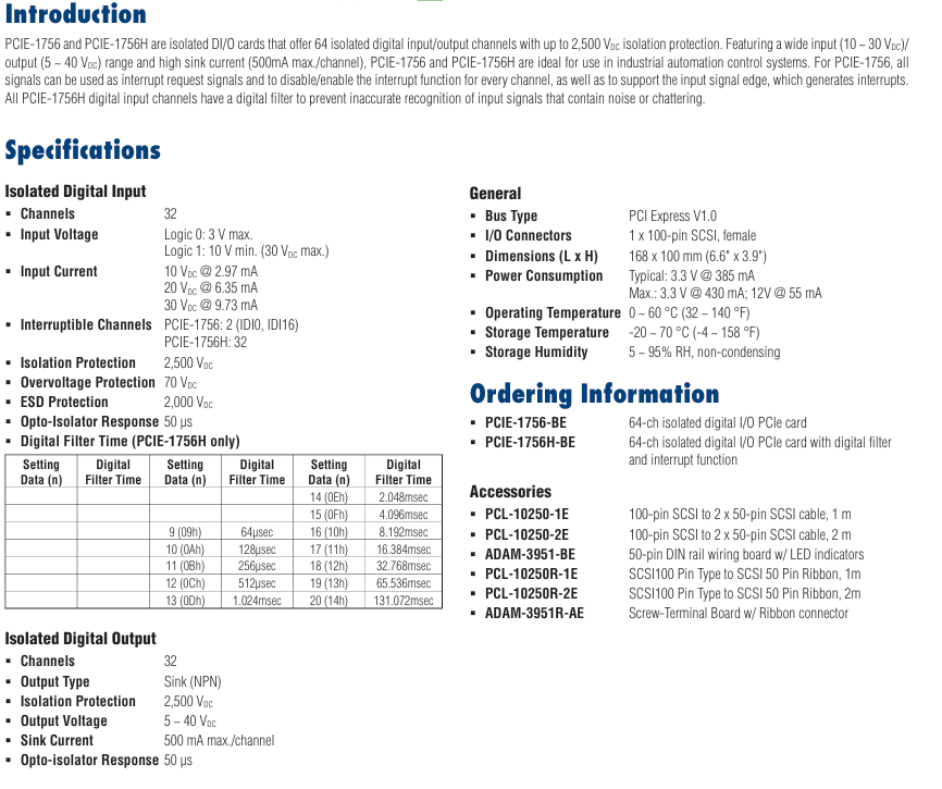 64-Ch Isolated Digital I/O PCIe Card 64-Ch Isolated Digital I/O PCIe Card with Digital Filter and Interrupt Function