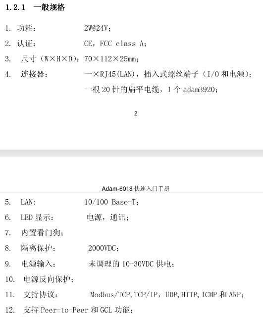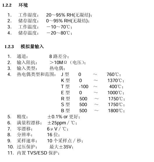 Adam-6018 是16位A/D模块、提供了8通道的热电偶输入和8通道的数字量输出, 它支持多种热电偶类型(Type J, K, T, E, R, S, B),并且将测量到的温度以工程量单位(℃) 输出给上位机。为了适应各种应用场合,ADAM-6018 的每个通道可以配置成不同的热电 偶输入类型。