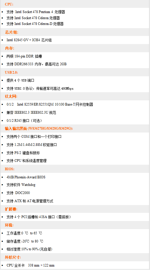 EHC-8450是高性能的Intel Pentium 4 CPU工控长卡。系统核心采用Intel 82845GV芯片。集成了2D/3D VGA 功能,高速USB 2.0 ,Winbond PCI – ISA bridge, 及可选Intel82559/er/82551QM 0/1/2以太网控制器。