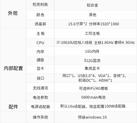 1、运行速度快,性能稳定,操作方便 2、酷睿Intel i7-10610U四核八线程 3、可选GPS定位、北斗,独立工业级硬件 4、铝合金全面加固,防摔防震 5、-10~50°C宽温正常运行