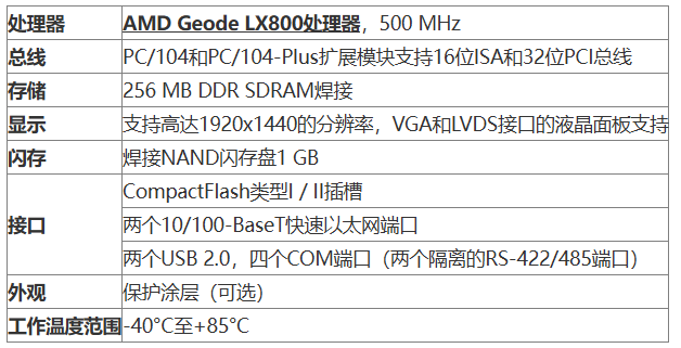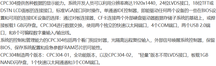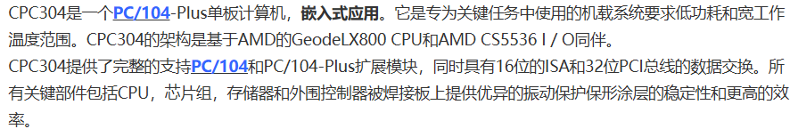 PC/104 CPU板 CPC304是一个PC/104-Plus单板计算机,嵌入式应用。它是专为关键任务中使用的机载系统要求低功耗和宽工作温度范围。CPC304的架构是基于AMD的Geode LX800 CPU和AMD CS5536 I / O同伴。