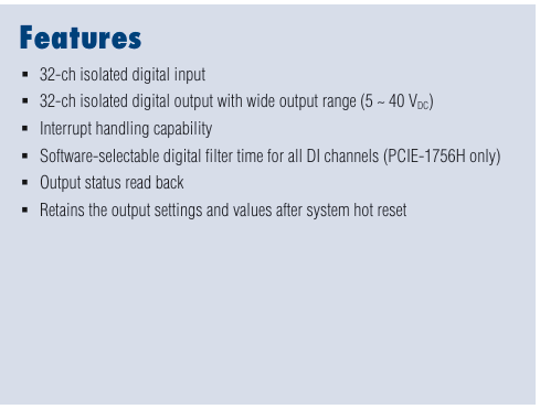 64-Ch Isolated Digital I/O PCIe Card 64-Ch Isolated Digital I/O PCIe Card with Digital Filter and Interrupt Function